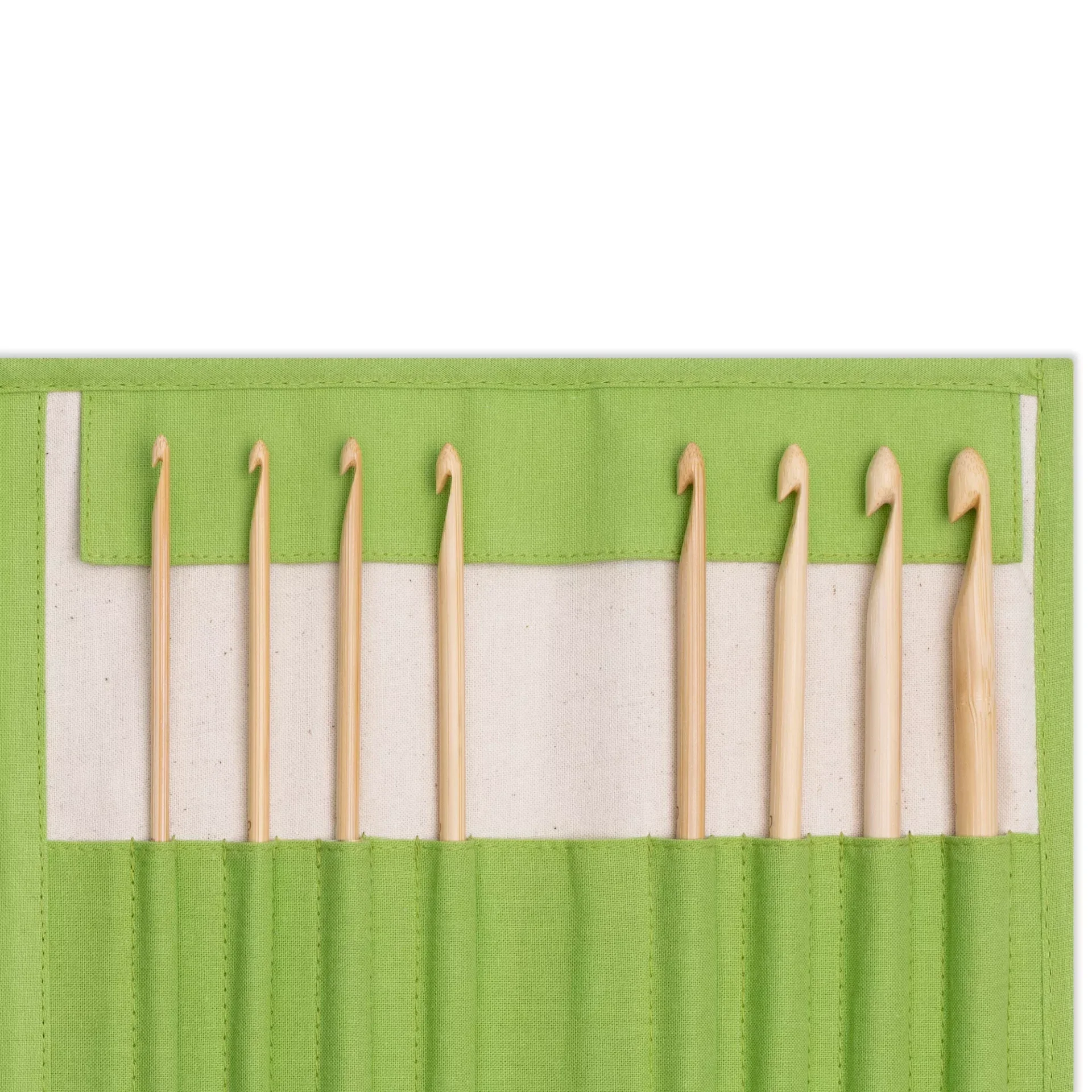 Wer beim Häkeln einfach nicht aufhören kann, wird diese leichten und extrem glatten Wollhäkelnadeln aus Bambus lieben. Gleich 8 Häkelnadeln von 3,5 mm bis 8,0 mm stecken in diesem Set – hübsch und wertig verpackt in der grün-beige-farbigen Tasche aus 100% Baumwolle. Dank des natürlichen Materials liegen die Wollhäkelnadeln angenehm warm in der Hand. Der Faden lässt sich optimal führen, denn er gleitet mühelos durch die perfekt ausgeformte Fadenrinne – das sorgt für einen gleichmäßigen Häkelvorgang und damit für ein wunderbar ebenmäßiges Maschenbild. Die Nadelstärke ist gut lesbar mittig auf der Nadel aufgebracht. Von A-Z nachhaltig: Die handgefertigten Wollhäkelnadeln werden aus chinesischem Bambus hergestellt, der schnell nachwächst und sich durch eine hohe Robustheit auszeichnet. In der Baumwolltasche sind die Häkelnadeln schnell sicher und platzsparend untergebracht, im innenliegenden Reißverschlussfach kann weiteres Zubehör verstaut werden.