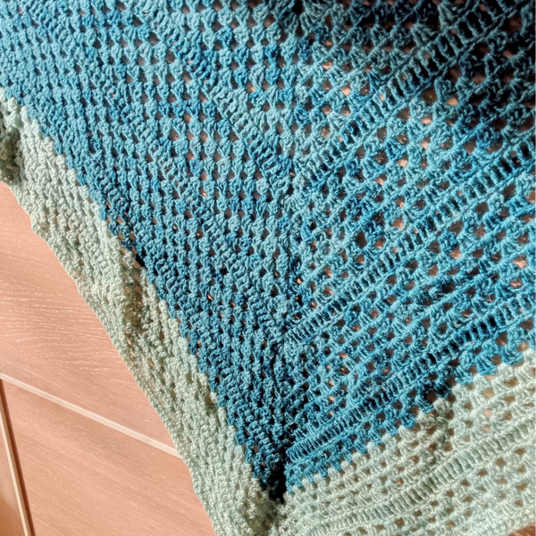 Du erhältst ein fertiges Tuch aus den Farben der Handfärbungen Minze und Turmalin. Das Tuch ist von Hand gehäkelt in der dünnsten der vier Garnstärken. Wenn gerade kein Ausstellungsstück fertig ist, wird es nach Bestellung extra für dich angefertigt. Daher beträgt die Lieferzeit manchmal etwa 2 bis 4 Wochen.
