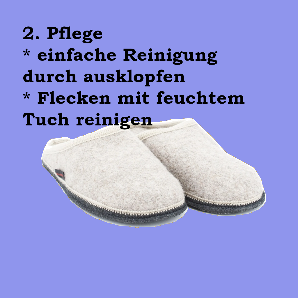 PFLEGE: Einfache Reinigung problemlos möglich. Einfach regelmäßig ausklopfen, um den Hausschuh von Staub und Schmutz zu befreien. Flecken nur mit einem feuchten Baumwolltuch entfernen und nie ganz durchnässen.