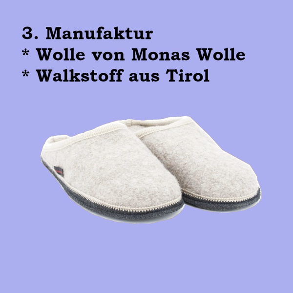 MANUFAKTUR: Die Hausschuhe sind Natur pur - Wolle aus der Wollmanufaktur Monas Wollkessel in Göttingen - Walkstoff aus der Manufaktur in Tirol.
