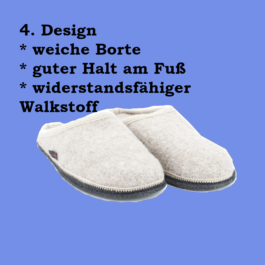 DESIGN: Das Oberteil unserer Pantoletten mit einer extra weichen Zierborte sorgt für einen guten Halt am Fuß und ist aus widerstandsfähigem Walkstoff in einem Stück nahtlos gefertigt.