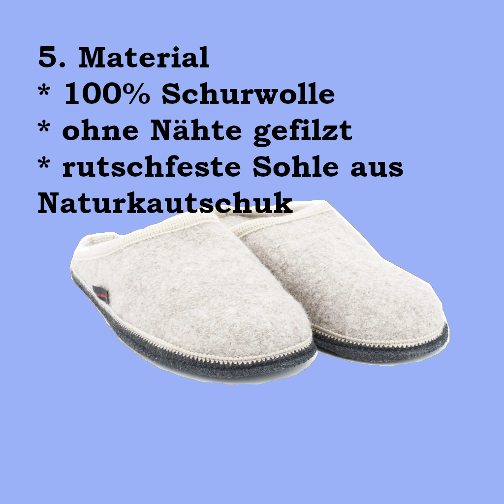 MATERIAL: Unsere Hausschuhe bestehen zu 100% aus Schurwolle und werden ohne Nähte gefilzt. Deine Füße werden vollständig von Walkstoff umhüllt, was zu einem gesunden und ausgleichenden Fußklima führt.